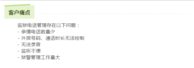 聯(lián)訊億科助力山東某監(jiān)獄親情電話系統(tǒng)實(shí)現(xiàn)改造升級(jí)按國(guó)家司法部監(jiān)獄管理局“人性化”管理要求,全國(guó)各個(gè)監(jiān)獄逐步開(kāi)通“親情電話”,用親情交流、社會(huì)幫教來(lái)促進(jìn)犯人穩(wěn)定思想、安心改造。由于犯人身份特殊,其撥打的親情電話須限制在法律規(guī)定范圍內(nèi),對(duì)親情電話進(jìn)行管理就非常有必要。